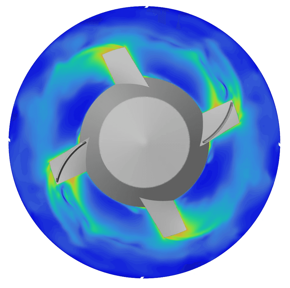 Ansys Fluent velocity field at the rotor plane - top-down view. The simulation resolved the turbulent flow structures generated by each rotor blade, including the high-velocity zones at blade tips and the complex wake patterns propagating outward toward the bedplate.